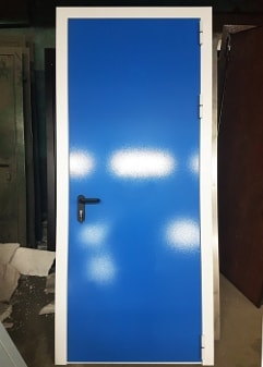 Изготовление синей огнестойкой двери с белыми наличниками для медучреждения